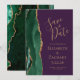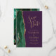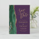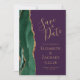 Det moderna bröllop spara datum-kortet från elegantens lämnat kant har en framväxande grönt vattenfärgsagat gräns som trimmas med faux guld glitter. Anpassadet kombinerar handskrift, rityta och kursivt typsnitt på guld-färgad i djup lila. Den omvända sidan har en matchande framväxande grönt och guld agate-design.