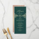 Elegant framträder grönt- och guld bröllop-menykort med delikata detaljer om blommigten och en romantisk rep-hjärtdesign. Perfekt för formella mottagningar, fall- eller vinterbröllop och sofistikerade banketmiddagar. Anpassa med menyval för namn, datum och anpassningsbar för att skapa en unik beröring för din speciella dag. Koordinerar på ett utmärkt sätt att matcha inbjudningar, skyltar och skrivbord från samma samling från emerald och guld.