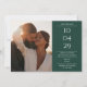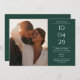 Ett modernt, minimalistiskt spara-date-kort med speciella datum-, foto- och bröllop-detaljer som anges i klassisk, chic-typografi på en framväxande grönt. Designad av Thisisnotme©