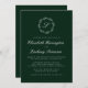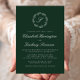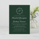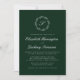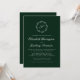Den här inbjudningsdesignen i elegant bröllop innehåller ett vitt skript, monogram, som inledningsvis omges av en botanisk andedräkt på en framväxande grönts bakgrund. Namn visas i vitt skript, med resten av texten i klassiskt serif-teckensnitt. Kortets baksida är en solid grönt.