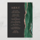 Höger kant på den här elegantens moderna meny bröllop har en framväxande grönt vattenfärgsagat gräns som trimmas med faux ro guld glitter. Anpassadet kombinerar ro rosa serif och kopparplåt typsnitt mot svart bakgrund. Den omvända sidan har en matchande framväxande grönt och ro guld agate-design.