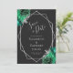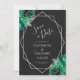Det här moderna bröllop spara datum-kortet i elegant har en silver-geometrisk ram som dekoreras med smaragd grönt och silver blommigt buquets på en svart bakgrund. I anpassadet kombineras silver grått med fysisk handskrift, tryckplåt och kursivt typsnitt. Den omvända sidan är solid off-black.