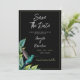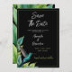 En slående bröllop-layout med en levande kräftfågel som går fram och tillbaka mellan lush tropiska löv, som alla ställs mot en dramatisk svart bakgrund med elegantens grönt och vit text. Perfekt för exotiskt, destinerat eller utomhusfritt firande.