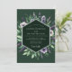 Embrace a moody and romantic atmosphere with this elegant design. A deep emerald green background sets the stage for a lush botanical arrangement. Sprigs of delicate purple lavender, pale anemones, and verdant green leaves create a beautiful wildflower-inspired display. This artwork is perfect for a sophisticated and natural union.
