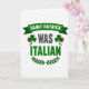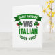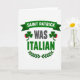 Designad med en ljus vit bakgrund, centrerar detta St. Patrick's Day-kort ett fräckt uttalande som lyder ”SAINT PATRICK VAR ITALIEN” i staplade rader. ”SAINT PATRICK” sitter tvärs över mitten på en djup smaragdgrön banderoll, och bokstäverna är vita så att de sticker ut tydligt. Strax nedanför visas ”VAR” i kolgrått, tyst överbryggande den övre raden till det sista ordet som en paus före poängen. Två små shamrockar sitter på vardera sidan om ”VAR”, färgade i en rik grön nyans med en liten röd halvmåneaccent som nickar mot Italien och tillför ett leende charm 💚. ”ITALIEN” förankrar den nedre sektionen i en ljusare grön färg, ger den nedre raden extra tyngd och får vridningen att kännas självsäker. En mörkgrön lagerkrans kurvar runt den nedre texten,