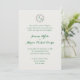This elegant wedding invitation features a delicate circle of leaves and vines framing your initials at the top, paired with classic serif fonts and romantic emerald script on a soft ivory background for a timeless, refined look.