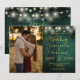 Denna smaragdgröna rustika bröllopsinbjudan med strängljus i trä kan anpassas med din information i modern guldtypografi och ett speciellt foto. Designad av Thisisnotme