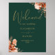 Denna eleganta rustika blommiga bröllopsväkommen skylt kan anpassas med din information i chic guldtypografi på en smaragdgrön bakgrund. Designad av Thisisnotme©