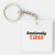 A bold and illustrative design featuring the phrase "Emotionally Tired." The word "Emotionally" is in a groovy, script-like black font with a white outline, while "TIRED" is in a large, chunky, orange bubble/psychedelic font. This design has a fun, retro, 70s vibe, contrasting the heavy sentiment with a playful aesthetic. Perfect for apparel, stickers, mugs, or print-on-demand products for anyone feeling overwhelmed or expressing a state of mental exhaustion in a stylish way.