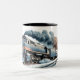 Ett kraftfullt diesellok, som är målat i ett blått och orange färg, ses som ett fortkörningssätt längs ett järnvägsspår. Tåg är långt, med många personbilar monterade, och strålkastarljuset tänder väg framför sig. Lotskomplexet skapar en dramatisk effekt. Den allmänna atmosfären är hastighet, makt och känsla för äventyr.