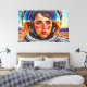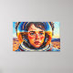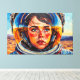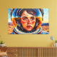 Denna digitala konst av Otis Porritt presenterar en slående närbild av en kvinna innesluten i en livfull gul hjälm för astronauter. Hennes ansikte, framställt med uttrycksfulla, måleriska penseldrag i varma hudtoner och djupblått för ögonen, blickar uppåt med en känsla av förundran. Hjälmens visir speglar en levande blå himmel, som speglar den vida, penseldragstexturerade himlen ovanför ett öde, sandigt landskap. Den impastoliknande tekniken, som är karakteristisk för digital konst som härmar traditionellt måleri, ger verket en dynamisk och taktil kvalitet, som betonar kontrasten mellan den detaljerade figuren och den stora, okända miljön.