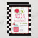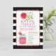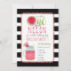 Tema för vattenmelon första födelsedag med "en i en melon"-textfras med vattenmelonsegment inbyggt i designen. Gräns är pom pom inspirerad. Bakgrunden är svart och vitt rand. Mason burk vattenmelon dricker i grund.