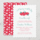Den här babyduschinbjudan har ett sött och lekfullt jordgubbstema. Bakgrunden är vit och dekorerad med en illustration av ljusröda jordgubbar med grönt löv. Längst upp, i ett roligt, ett kursivt stil-typsnitt, står det i texten: "En bären söt baby är på väg!" Nedan, i en blandning av elegant och lekfullt typsnitt, anges evenemangets detaljer, inklusive honungens namn, datum, tidpunkt, plats, OSA och presentregisteruppgifter. Den övergripande designen är charmerande, varm och perfekt för att fira att en liten person kommer att anlända!