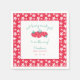 Det här är en anpassade babyduschnapkin med ett charmerande jordgubbstema. Utformningen har ett rött gräns med vit daisy-liknande blommor och en vit ruta i mitten. Inuti fyrkanten finns en illustration av tre röda jordgubbar med grönt löv, som ger en lekfull och söt beröring. Texten, skriven i en blandning av kursivt och tryckt typsnitt, lyder: "En söt flicka är på väg!" Nedan, i ett kompletterande typsnitt, visningar den honungens namn och händelsemedagen. Napkin har en färsk, vismisk och feminin estetisk perfekt för jordgubbskläder eller fruktblåsor. Det är anpassadet som gör det möjligt för namn och datum att vara personlig för att passa alla firande.