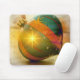 Ett foto av en skarp och strålande julklapp för att dekorera träd. Det här festliga boll är grönt och gult med blek orange rand och formas som en luftballong omgiven av guldstjärnor och cirklar.