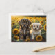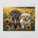 Två valpar, en brun och den andra grädden, sitta i en serensolros fält.