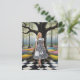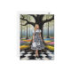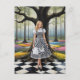 AI genererade blond kvinna i en svart och vit bock på ett svart och vitt checkat golv i en färgfull magisk schackbrädesskog