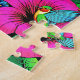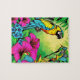 I denna bedövande tropiska illustration finns en briljant färgad som i förgrunden har en stor maka som visar dess vibrerande blått, gult och grönt fjädrar. Makan fungerar som en slående brännpunkt mot bakgrunden av en lush djungel som sliter med livet. Omkring är det strålande blommor av rosa hibiscus, tillsammans med känsliga blå blommar, som stärker den exotiska ambitionen i detta verdanta paradis. Fåglarna, som är snygga i grönt, orange och gult, fliter runt scenen och injicerar energi och rörelse i sammansättningen. Bakgrunden har en riklig grön miljö, med mjuk solfiltrering genom kanopin, som skapar en stark men dynamisk atmosfär som inbjudan tittare kan gå in i denna tropiska hamn.