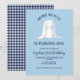 En kanin vänder en födelsedagsfest inbjudan i blått med gingham tillbaka.