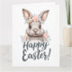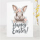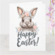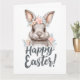 En charmig handmålad påskillustration med en söt kanin som bär en färgrik vårblomsterkrans. Mjuka pastelljus och känsliga penseldrag fångar glädjen och fräschheten i säsongen.