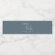 Minimalistiskt etikett för vattenflaska för bröllopsrepetitionens middag med typografi text som säger "en dag till". Bakgrunden är stålblå.