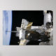En dockad Soyuz rymdfarkost över den dockade rymdfärgen Atlantis med STS-129.