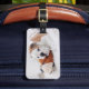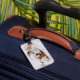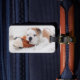 En engelsk bulldoggvalp som leker med en bulldogg bagagebricka