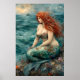 AI skapade en del av en vacker sjöjungfru som vilar på ett sten bredvid havet och där många söt blommor växer omkring