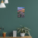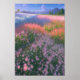 Denna vackra poster fångar den andningsfulla synen från ett stort fält täckt av blått, rött och lila blommor. Fält sträcker sig mot ett stort bergsområde i avstånd, eftersom det tydliga blå himmel fungerar som perfektens bakgrund.