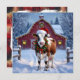 En vacker julkort med en illustration av en festlig ko i en tomtehatt som står framför en vacker röd lada dekorerad med julbelysning och en festlig krans på en snöig vinterdag. Du kan lägga till din egen anpassade julhälsning, namn och adress i det personliga området.