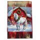 En söt julklapp med en illustration av en vit häst framför en underbar röd lada som dekoreras i jul-ljus och en festlig krans på en snövinter-dag.