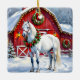 En söt julprydnad med en illustration av en vit häst framför en underbar röd lada som dekoreras i jul ljus och en festlig krans på en snövinter dag. På baksidan kan du lägga till ett eget anpassningsbar-meddelande.