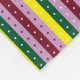 Utformningen har en mönster som består av vågrät rand i olika färg, inklusive gult, grönt, lila och rosa. Mellan dessa färgader är rand tunnare vitt rand. Varje färgad läggs rand i med en sekvens av små punkter som är jämnt fördelade längs rand. Punkter visas i färg i kontrast till den rand de är på, t.ex. vita prickar på ränderna lila och grönt och svarta prickar på ränderna gult och rosa. Detta repetitiva mönster skapar ett visuellt stimulerande struktur som skulle kunna användas för bakgrunder, textilier eller annat inslag på grund av dess pulserande färg och rytmiska punktsekvenser.