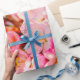 En närbild av en massa vidlyftiga sakurablommor på en träd-twig. Söt rosa färg. Mjuk blå bakgrund. Hanamis skönhet - körsbärssäsongen som blommarna tittar på. En extra-stor digital målning från ett foto. En unik blommigt som är papper för att slå in dina presenter på firande, bröllop, födelsedag, babydusch eller något annat evenemang. Du kan överföra den här designen till en mängd olika produkter, t.ex. mjukpapper, band, presentväska, trälåda, ull, sherpa, kast, babyfiltar, kavajer och runda kuddar, kuddar, badmatt, bordstablett, elektroniksäck, julstrumpor och träd-kjolt. Välj bara produkten från alternativet "Överför design till en produkt" (rullningsbart). Den här designen är öppen för anpassning. Använda bara knappen "Anpassa" eller "Redigera design" (som fodral kan vara) i det blå färg eller länken "Information" —> "Klicka för att anpassa ytterligare". Du kommer att flyttas till "Design Verktyg"-sidan där du enkelt kan använda alternativet "FYLLNING/ANSLUTNING" för att JUSTERA PRODUKTENS UTFORMNING TILL STORLEK OCH FORM, rotera den, spegel och ändra texten, färg om teckensnittet (om sådant finns) eller lägga till en egen text från början. Var bara kreativ, ha roligt och vara lycklig.