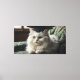 En vit katt med slående grönt ögon ljuger på en grönt armstol med blommönster. Katten bär stolt på en studentmössa, och uteslöt charm och en känsla av prestation i ett varmt, inbjudande utrymme.