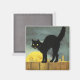 Vintage Halloween-illustration som visar en svart katt på ett staket med en månskiva bakom.
