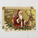 Det här julkortet i vintage-stil har en klassisk illustration av jultomten iförd en traditionell lång röd kappa med vit pälsbesättning, och bärandes en säck över axeln som svämmar över av dockor och leksaker. Han står bredvid en stor ren och håller i dess lädertöm mot en strukturerad guldfärgad bakgrund. Scenen är infattad längst ned av festliga grenar med julnypon och mistel med vita bär, medan hälsningen "A Happy Christmas Tide" visas i elegant vit text på det övre vänstra hörnet.