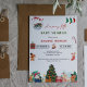 En Merry Little Baby Shower-inbjudan med ett traditionellt vinter-naturtema och bra-kalligrafi. Könsneutral design med vattenfärgen Julgran, gräs,, fordon, Santa och gräs. Baby Shower är skriven i handskriven typografi, och mallen är redot för dig att lägga till information om inbjudan i duschen.