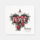 En gotisk romantik. En ornat, gothic-stil ram som omger en beige bakgrund. Röd ros med mörk grönt löv är placerat runt ram, särskilt i hörnen. I mitten av grund finns ett dekorativt hjärtformat emblem med ord "KÄRLEK" inskrivet i ett stiliserat typsnitt.