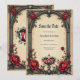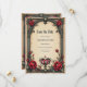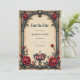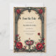 En gotisk romantik. En ornat, gothic-stil ram som omger en beige bakgrund. Röd ros med mörk grönt löv är placerat runt ram, särskilt i hörnen. I mitten av grund finns ett dekorativt hjärtformat emblem med ord "KÄRLEK" inskrivet i ett stiliserat typsnitt.