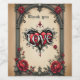 En gotisk romantik. En ornat, gothic-stil ram som omger en beige bakgrund. Röd ros med mörk grönt löv är placerat runt ram, särskilt i hörnen. I mitten av grund finns ett dekorativt hjärtformat emblem med ord "KÄRLEK" inskrivet i ett stiliserat typsnitt.