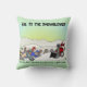 En dekorativ kudde med en lustig tecknad om att göra en snöblåsare. Originalteckningar efter DB-Tecknader.