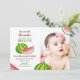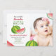 Fira din lilla älsklings första födelsedag med denna roliga och fruktiga "One in a Melon" fotoinbjudan! Med ljusa vattenmelonillustrationer, lekfulla frödetaljer och ditt barns anpassade foto är denna glada design perfekt för en sommarinspirerad födelsedagsfest. Anpassa namn, festdetaljer och RSVP-information för en unik firande. Ett fräscht och bedårande sätt att inbjuda gäster till din lilla flickas milstolpe!