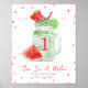 Ett i melon-temat: 1:a födelsedag med illustration av en vattenmelonkalk smoothie i Mason burk omgiven av konetti.