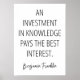 Ett vackert Benjamin Franklin-citat. Låt oss bli utbildad. Låt oss lära mer och sedan ännu mer. Det är det bästa sättet att investera vår tid! En kunskapsinvestering betalar det bästa - Benjamin Franklin inspirationsot