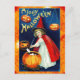 En söt vintage Halloween-vykort som visar en underbar liten häxflicka med flera jack-o-lanternpumpor. Hon bär en vit klänning med en röd häxhatt och ett gungande. Illustration från Ellen Clapsaddle HTM Bilder