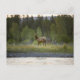 En kvinnlig älgstativ tittar vid kameran med en vykort