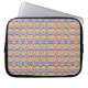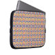 En laptopsleeve med ett livligt, invecklat geometriskt mönster i gult, blått och rosa. Tonen är färgrik och livlig, vilket förbättrar tekniktilbehöret.