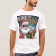 En levande och lekfull julmatad T-shirt-grafik med en tecknad-stil Jultomten som bär solglasögon och en mysigt röd tröja. Han håller en stor mugg av hett kakao med marshmallow, och det finns ett litet snöflingor som lätt faller runt honom. Bakgrunden är en snöbys med färgstarka hus och skör ljus. Över tomten, i fet, fjällande text, står det: "Slimra Helgdagarna i en roligt, med vismiskt typsnitt. Det övergripande färg-programmet omfattar , gröntar, golder och vita, med en aning blått för himmel och snö.