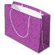 en glittrig lila presentpåse med vit insida och vita handtag, placerad i en vinkel för att visa framsida och sida